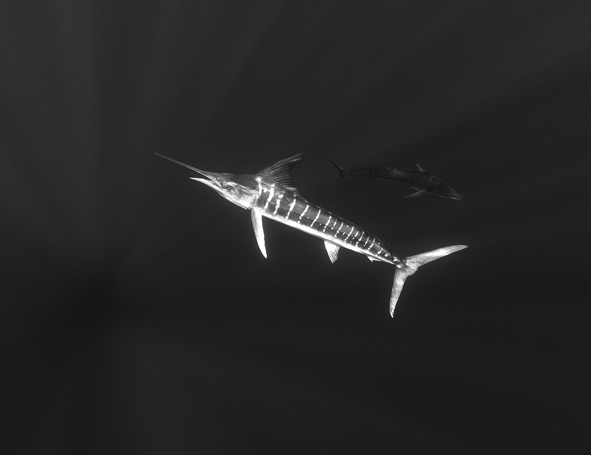 Photographing marlin from underwater is not particularly difficult when you find them feeding during fall near Magdalena Bay. The reason is that the fish are abundant here, and their behavior is predictable. They congregate over high spots, where massive amounts of bait fish are found. The natural annual event is described as the Mexican sardine run.