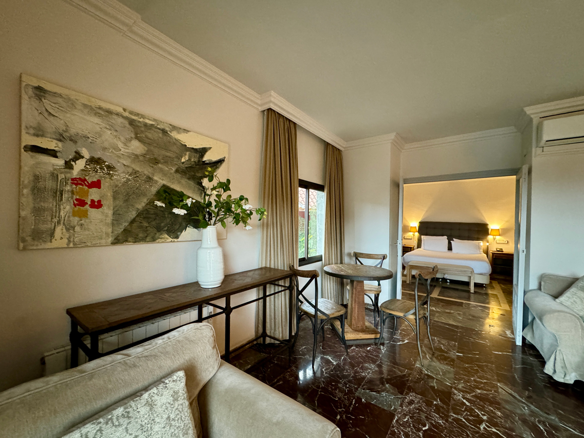 The entrance to our suite led us immediately into a kitchen, complete with stove top, fridge, and more. As we rounded the corner, a glorious ocean view greeted us just beyond the balcony. I immediately went out to say hello. That was when I knew our time here would be fantastic. When I finally turned around and stepped back into the immense living room, I jumped onto the extremely comfortable sofa. Then I tested out one of the lounge chairs. I felt so relaxed! These were all so comfortable. I also loved the marble floor, as well as a the art on the walls. Moreover, the room featured a beautiful table and chairs next to a side window with a view of the courtyard below. Having just arrived from Barcelona, where some of our accommodations were more functional than fabulous, I was in heaven.