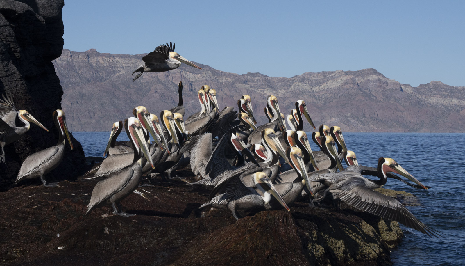 For our Isla Coronado tour, we met again at the lighthouse just above the dock. Lezley (co-owner of Guaycura Adventures) led us to our boat for the day. Her husband/co-owner and captain, Argenis gave us our life jackets, and we selected our seating (Find out more about Guaycura Adventures-link below). I grabbed my favorite comfy seat next to our captain, while Rich started spreading out his camera gear in the front towards the bow. We waved goodbye to Lezley and enjoyed the variety of birds that are ever-present at the dock. Numerous pangas were heading out to sea on their various excursions. With a nice group of excited guests on board, Captain Argenis headed straight towards the back of Coronado Island. The volcanic rock was stunning. He explained that Isla Coronado is a dormant volcano. The sea was calm, and the weather was glorious.