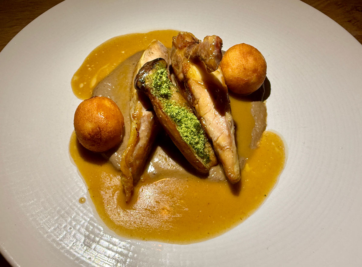 The mushroom risotto dish was a work of art! The huge ball looked majestic as it sat on a throne of quince aioli like a mighty King, while autumn fruits lounged around the plate or court as it would seem. I especially enjoyed the risotto in conjunction with the quince aioli. It offered a glorious garlic flavor with a hint of citrus. This merged especially well with the umami earthiness of the risotto.